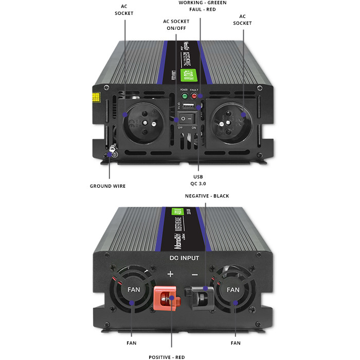 Puzdro je navrhnuté z kvalitného hliníka, ktorý je odolný voči nárazom a mechanickému poškodeniu. Je ideálnou voľbou pre tých, ktorí radi dlhodobo cestujú. Vďaka meniču so zabudovanou zásuvkou môžete používať takmer všetky zariadenia, ktoré vyžadujú pripojenie do zásuvky. Výrobok má port USB na nabíjanie mobilných zariadení a ventilátor, ktorý sa stará o správne chladenie .