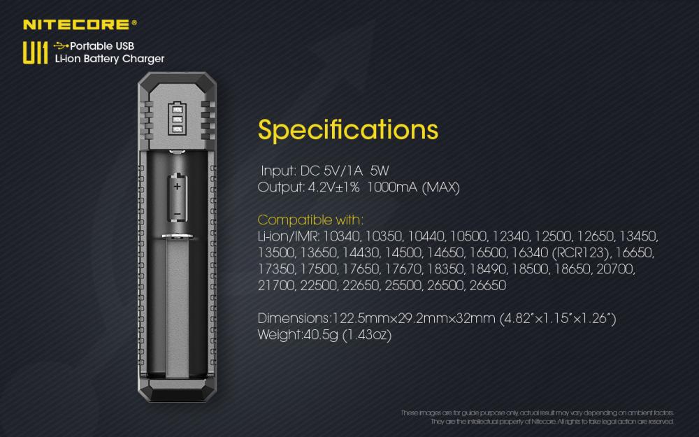 -kompatibilné s: Li-ion/IMR: 10340, 10350, 10440, 10500, 12340, 12500, 12650, 13450, 13500, 13650, 14430, 14500, 14650, 16500, 16340 (RCR123), 16650, 17350, 17500,17650, 17670, 18350, 18490, 18500, 18650, 20700, 21700, 22500, 22650, 25500, 26500, 26650