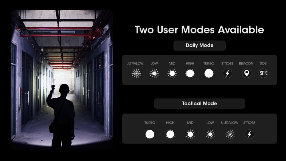– 5 voliteľných módov, plus stroboskopický, maják a SOS mód.